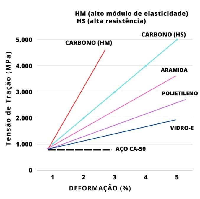 Na figura 1.1 que mostra o gráfico de tensão x deformação, acompanhe algumas das principais propriedades mecânicas das fibras de carbono, fibra de vidro e aramida, e de outros materiais utilizados na construção civil como o aço.